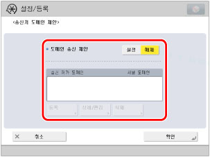 (설정/등록) → [기능 설정] → [송신] → [이메일/I-팩스 설정] → [송신처 도메인 제한]을 누릅니다.