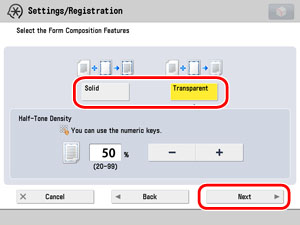[투명합성]을 선택한 경우 [-] 또는 [+]를 눌러 하프톤 농도를 조정합니다.