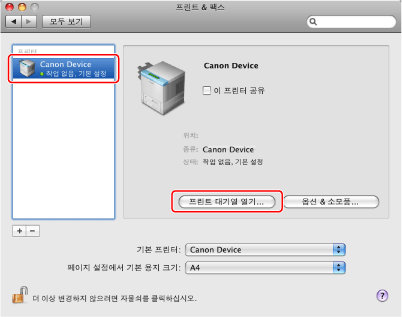 프린터를 선택하고 → [프린트 대기열 열기]를 클릭합니다.