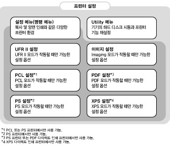 프린터 설정은 아래 메뉴로 구성됩니다.