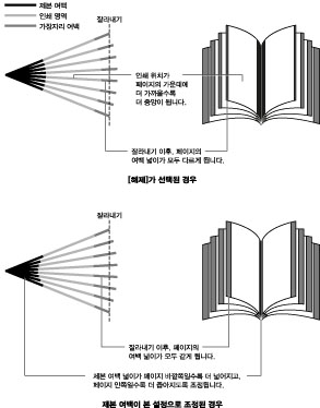 수도 있습니다(가장자리가 동일하도록 자른 경우 페이지 수와 용지 두께에 따라 다름). 제본 여백을 조정하는 데 크립 교정을 사용하면 그러한 고르지 않는 인쇄(크립)를 보정할 수 있습니다.