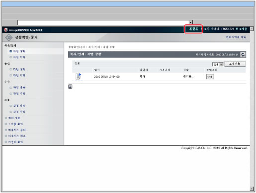 리모트 UI를 사용하여 네트워크를 통해 기기에 액세스하여 기기의 현재 상황과 설정, 모든 정보 및 작업 처리 상황을 표시할 수 있습니다. 기기 자체에서 조작을 수행하지 않고도 네트워크에 연결된 컴퓨터에서 기기를 관리할 수 있습니다. 기기의 IP 주소를 웹 브라우저에 입력하면 아래 표시된 대로 리모트 UI 의 첫 페이지 또는 메인 화면이 컴퓨터 화면에 표시됩니다.