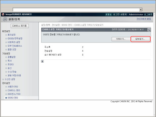 [설정/등록] → [수신인 설정] → [주소록 내보내기 설정] → [주소록을 내보내기할 때 비밀번호 포함]이 선택됩니다.