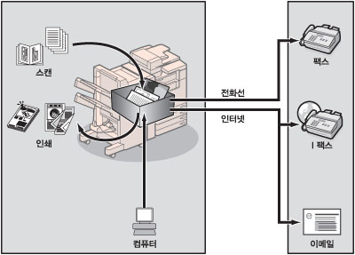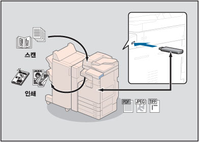 이 기기에서 원고를 스캔하여 (PDF, JPEG 및 TIFF 등의 파일 형식으로) 저장할 수 있고 원하는 인쇄 설정을 사용하여 언제라도 이 기기에서 저장된 파일을 인쇄할 수도 있습니다.