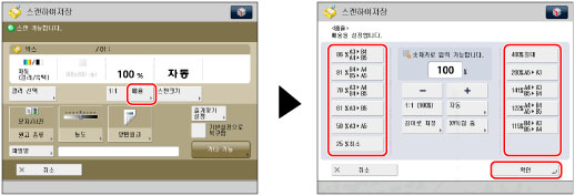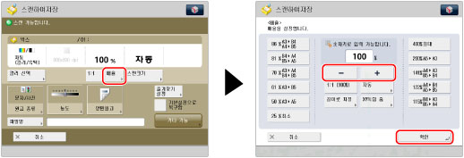 [배율]을 누르고 →[-]와 [+]를 사용하여 줌 배율을 조정한 후 → [확인]을 누릅니다.