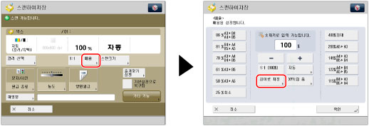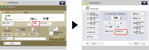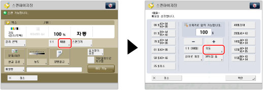 기기가 입력한 값에 따라 정확한 배율(줌)을 자동으로 계산합니다. 하지만 원고 이미지가 용지 크기에 따라 조금 잘릴 수도 있습니다.