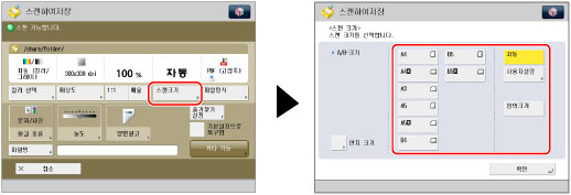 [스캔크기]를 누르고 → 스캔 크기를 선택합니다.