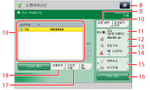 팩스 수신인을 표시하려면 [팩스기능 표시]에 대해 <<스캔하여 송신>에 팩스 표시>을 '설정'으로 지정합니다. (See "팩스 기능 표시.")