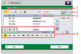 영숫자 키(예: [ABC])를 눌러 각 문자 또는 숫자에 대한 개별 키를 표시합니다. 문자 또는 숫자를 선택하여 표시된 입력 항목의 범위를 제한할 수 있습니다. [모두]를 눌러 전체 주소 리스트로 돌아갑니다.