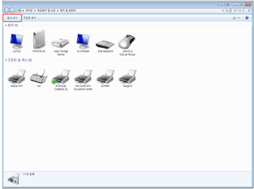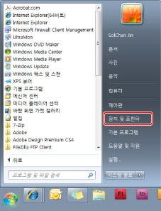 (시작) → [장치 및 프린터]를 클릭합니다.Windows 8의 경우 바탕 화면 맨 위 오른쪽(맨 아래 오른쪽)에 커서를 놓고 → [설정] → [제어판]을 선택한 다음 → [하드웨어 및 소리]에서 [장치 및 프린터 보기]를 선택합니다.