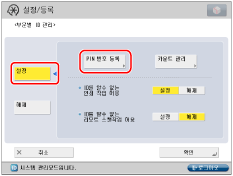 제어 카드를 사용하여 기기를 관리하고 있으며 [기능제한]에서 제한이 '해제'로 설정되어 있는 기능이 있으면 기기가 시동될 때 메인 메뉴 화면이 나타납니다. 이 경우 제어 카드를 삽입하지 않고 1단계부터 절차를 수행합니다.