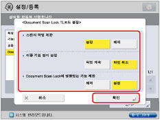 내장 정보와 함께 문서를 복사, 스캔 또는 인쇄하려 할 때 Document Scan Lock*에 영향을 주는 기능을 설정한 경우, 그 작업은 취소되며 터치 패널 화면에 <기입 정보가 검지되었기 때문에 작업을 취소하였습니다.>라는 메시지가 표시됩니다.