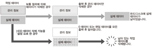 이 기기는 관리 정보 및 실제 데이터로 복사, 송신, 수신 및 인쇄 시 작업 데이터를 분리하고 저장합니다. 관리 정보는 작업이 완료될 때 자동으로 삭제되지만 실제 데이터는 하드 디스크에 저장됩니다.