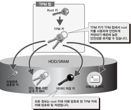 TPM 설정 모드를 사용하여 하드 디스크 또는 SRAM에서 관리되는 비밀번호 및 증명서 정보를 암호화할 수 있습니다.