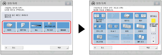 복사 화면에 표시되는 단축키에서 모드를 등록할 수 있습니다. [기타 기능] 및 [즐겨찾기 설정]에서 원하는 버튼을 5개까지 등록할 수 있습니다.