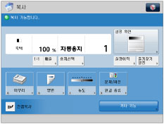 [부문별 ID 관리]가 ‘설정’이고 기능 제한으로 제한된 기능이 기본 화면에서 설정된 경우 시작할 때 메인 메뉴 화면이 나타납니다. ([부문별 ID 관리]가 ‘설정’으로 된 경우, [복사]는 기능 제한에 의해 제한됩니다. 기본 시작 화면에서 설정한 기능을 표시하려면 메인 메뉴 화면에서 기능을 선택하고 → 로그인 화면에서 부문 ID/비밀번호를 입력합니다.
