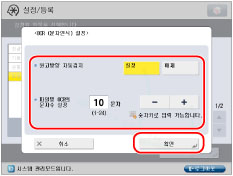 <원고방향 자동검지>에서 [설정]을 누르고 → <파일명 OCR의 문자수 설정>에서 [-] 또는 [+]를 눌러 파일 이름으로 문자 수를 설정한 다음 → [확인]을 누릅니다.