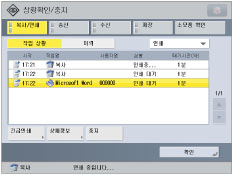 (상황확인/중지)를 누르면 복사/인쇄, 송신, 수신 및 저장 작업의 상황을 확인하고 변경할 수 있는 상황확인/중지 화면이 나타납니다.