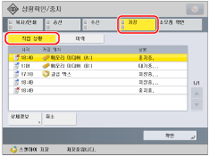 선택한 작업에 대한 상세 정보를 표시합니다. 상세 정보를 확인하고 → [확인]을 눌러 복사/인쇄 화면으로 돌아갑니다.