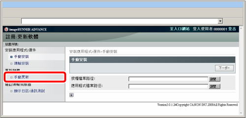 從「遠端使用者介面」的入口網站頁面,按一下[設定/註冊]→[授權/其他]→[註冊/更新軟體]。
