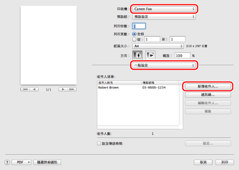 選擇傳真機 → [一般設定] → 按一下[新增收件人]。