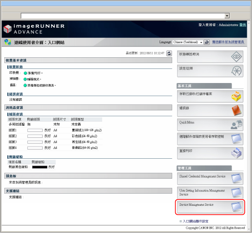 在「遠端使用者介面」的入口網站頁面上,按一下[Service Management Service](服務管理服務)。