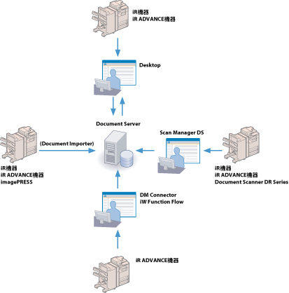 可以將使用iW Scan Manager DS匯入的文件發佈到在多種商業環境中使用的iW系列核心軟體產品「Document Server」。