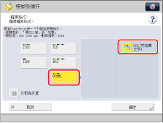 若選擇PDF或XPS作為檔案格式,可以同時設定[壓縮]和[OCR(可搜尋文字)]。在這種情況下,「掃描後傳送基本功能」螢幕上顯示的檔案格式為[PDF(壓縮)]或[XPS(壓縮)]。