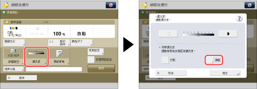若透過按<背景濃淡度>的[調整]調整背景濃淡度,則會取消[自動]設定。同樣,若在[調整]中進行手動調整時按[自動],則會取消所作的調整。本機器自動調整濃淡度以與背景一致。