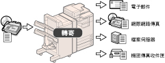 本機器提供多種方便的掃描功能,例如雙面原稿掃描和書本原稿掃描,也可以將分開掃描的文件合併並傳送。也可以根據所掃描原稿的類型設定適當的曝光、色彩模式和掃描尺寸。此外,可以儲存優先掃描設定並可以隨時恢復。