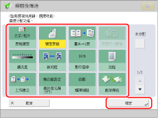 「掃描後傳送」螢幕上顯示兩個選項快速鍵。[雙面原稿]和[不同尺寸原稿]顯示為預設設定。可以將這些快速鍵變更為常用的功能。