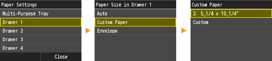 Specifying Paper Size and Type in the Multi-Purpose TrayThe registered paper sizes are displayed when you set the default paper settings for the multi-purpose tray. From the screen, you can select one of the displayed sizes as the default paper size for the multi-purpose tray.