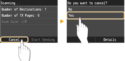 The number of sending document, settings, and other details are displayed. If you only want to check the details without sending, press