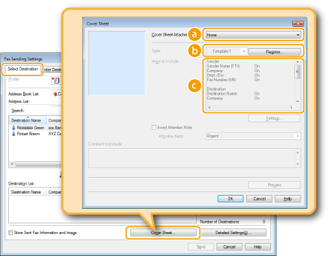 You can attach a cover sheet to the document you are sending. Select a cover sheet from three preset cover sheets in the fax driver, or create your own custom cover sheets. For more information, click [Help] on the fax driver screen.
