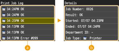 2 | Tap the document whose log you want to check. ![]() <Print Job Log>Displays a list of the documents that were printed. <OK> is displayed when a document was printed successfully, and <Error> is displayed when a document failed to be printed because it was canceled or there was some error. <Details>Displays detailed information about the document tapped from the list. The displayed document name or user name may not reflect the actual document or user name. ![]() If the <Result> column shows a three-digit number This number represents an error code. When an Error Code Appears |