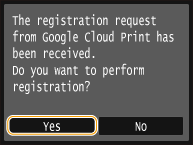 Registering from a mobile device or Google ChromeYou can also register the machine from a mobile device or Google Chrome*. The machine's display shows the following confirmation screen before completion of the registration. Press <Yes> to complete the registration. * For the registration procedure, see the instruction manual for your mobile device or the Google Cloud Print website. |