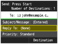 The reply-to address is not set by default. If you want to notify the recipient of the reply-to address, specify the address from among those registered in the Address Book. If no destination is registered in the Address Book, see