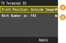 Specifies the position to print the terminal ID information in the sent fax. Select <Inside Image Area> to print the information inside the image area, or <Outside Image Area> to print the information outside the image area.
