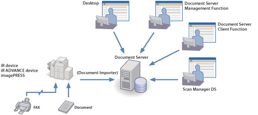 imageWARE Document Server is a document management server which uses imageWARE Document Server Client Function or imageRUNNER ADVANCE Desktop as a client. In addition to documents created using these clients, it is also able to store scanned documents via the network such as from the imageRUNNER series of multi-function digital devices and the document scanner DR series. This makes it possible to build a highly functional document management system for efficiently managing stored documents.