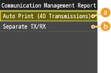 Select <On> to print sent and received reports separately, or <Off> to print both reports on one sheet.