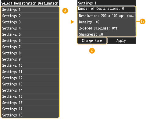 You can register up to four frequently used combinations of fax settings. By simply selecting a registered setting combination when it is needed, you can eliminate the need to configure the same settings every time you send a fax, such as if you frequently set the number of recipients to 5, set 2-sided original, and increase the sharpness when faxing. You can register the setting combinations as <Settings 1> to <Settings 18>.