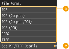 ![]() | You can select the file format into which documents are converted. Scanned documents are converted into the file format specified here, and then sent to the specified destination. |