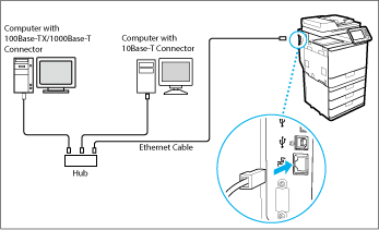 Connect the machine to a computer via a router. Use a LAN cable to connect the machine to the router.