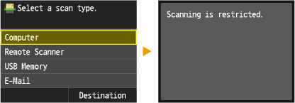 If the check box is selected, you can select <Computer> or <Remote Scanner> on the main scan screen and scan documents into a computer anytime. Clear the check box to disable scanning even if <Computer> or <Remote Scanner> are selected when Department ID Management is enabled.