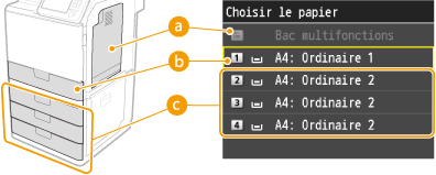 Spécifiez la source de papier qui contient le papier à utiliser pour l'impression des copies.