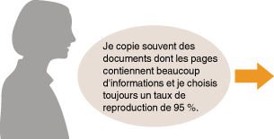 Changez le taux de reproduction en choisissant un taux de 95 % et enregistrez-le comme réglage par défaut. Par la suite, vous effectuerez des copies sans avoir à modifier le taux de reproduction. Modification des réglages par défaut
