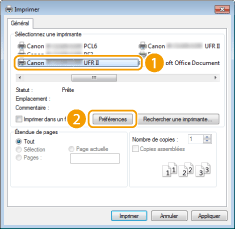Sélectionnez le pilote d'imprimante de l'appareil et cliquez sur [Préférences] (ou [Propriétés]).