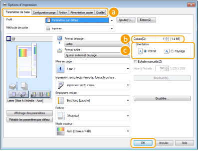 Spécifiez les réglages d'impression tels que le nombre de copies et l'orientation et cliquez sur [OK].