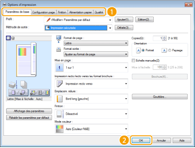 Cliquez sur les onglets [Paramètres de base], [Configuration page], [Finition], [Alimentation papier] ou [Qualité] pour choisir les réglages d'impression figurant sur chaque écran.
