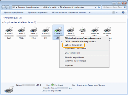 Cliquez avec le bouton droit sur l'icône de votre imprimante, puis cliquez sur [Options d'impression].